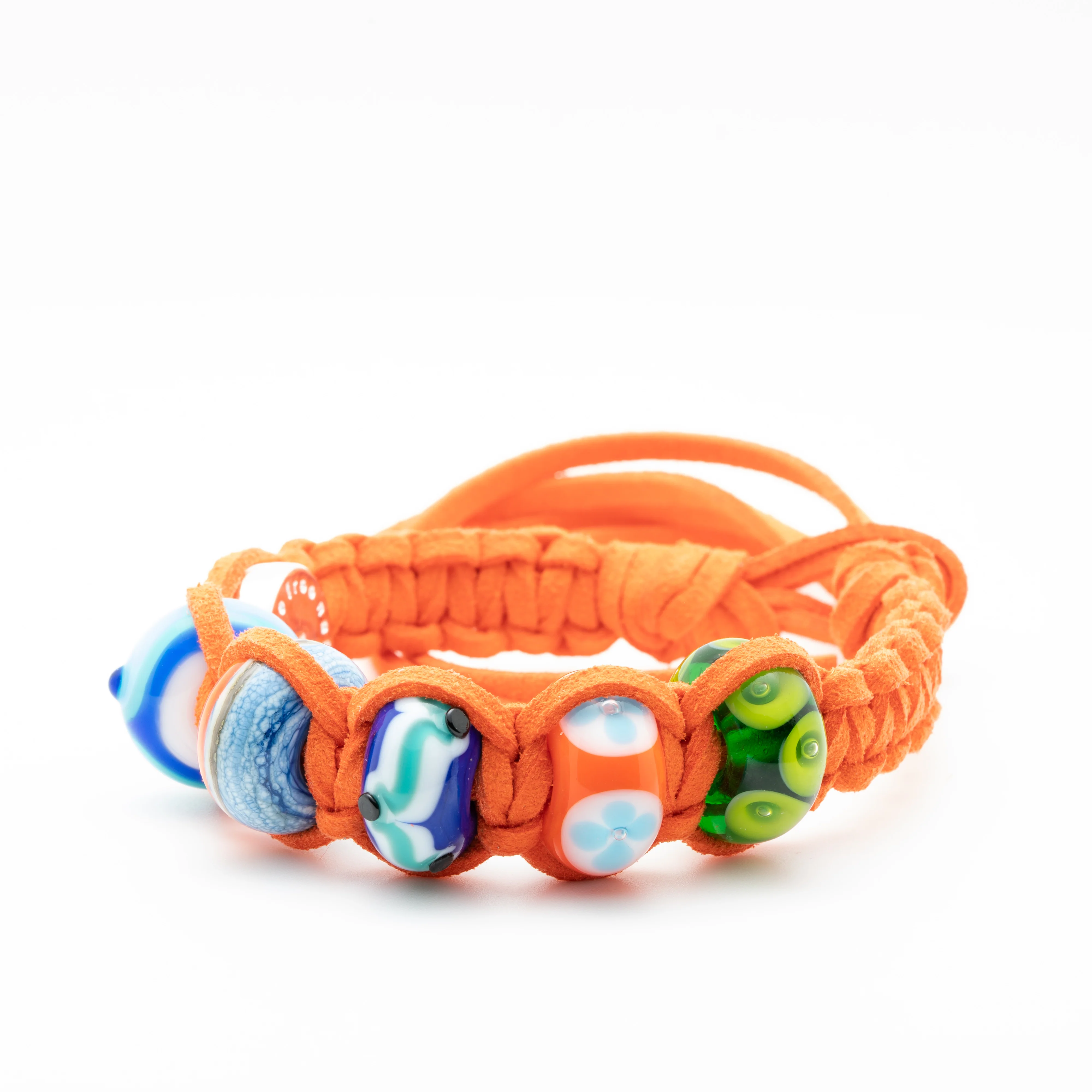 We wanted all the beads in our Australian Surf Collections to be bright and vibrant! We chose this bold orange glass for Burleigh Heads decorated with blue wave petals rolling in over white sands.