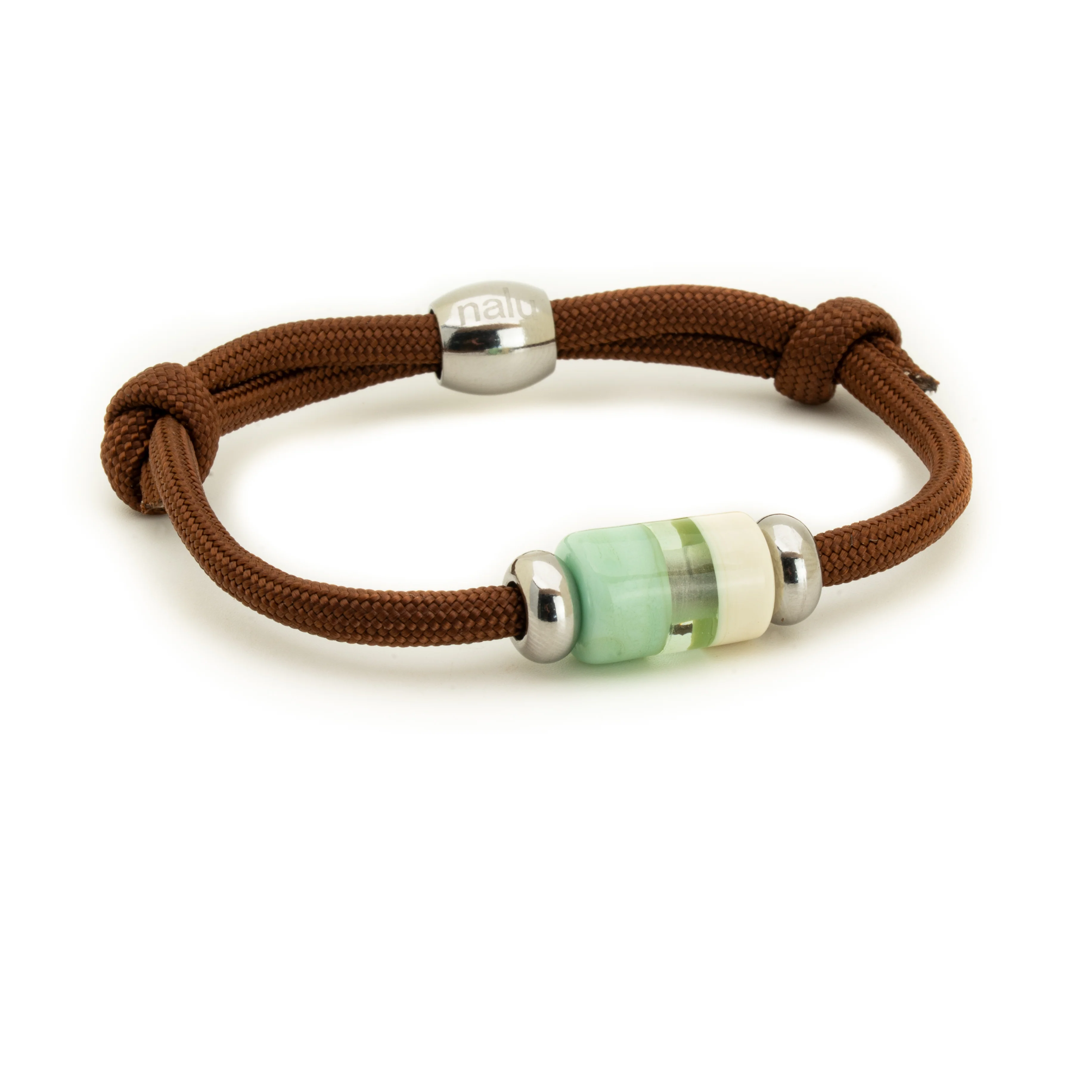Your bead will be fitted to your choice of either a light green, sand or brown paracord bracelet which will come with a set of stainless steel Nalu Swirl stoppers either side of the bead and steel Nalu toggle bead on the back. Paracord is a durable, waterproof 4mm cord made from nylon. Please expect variations in colour of the cord and glass, each piece is individually handmade to order in our studio.
