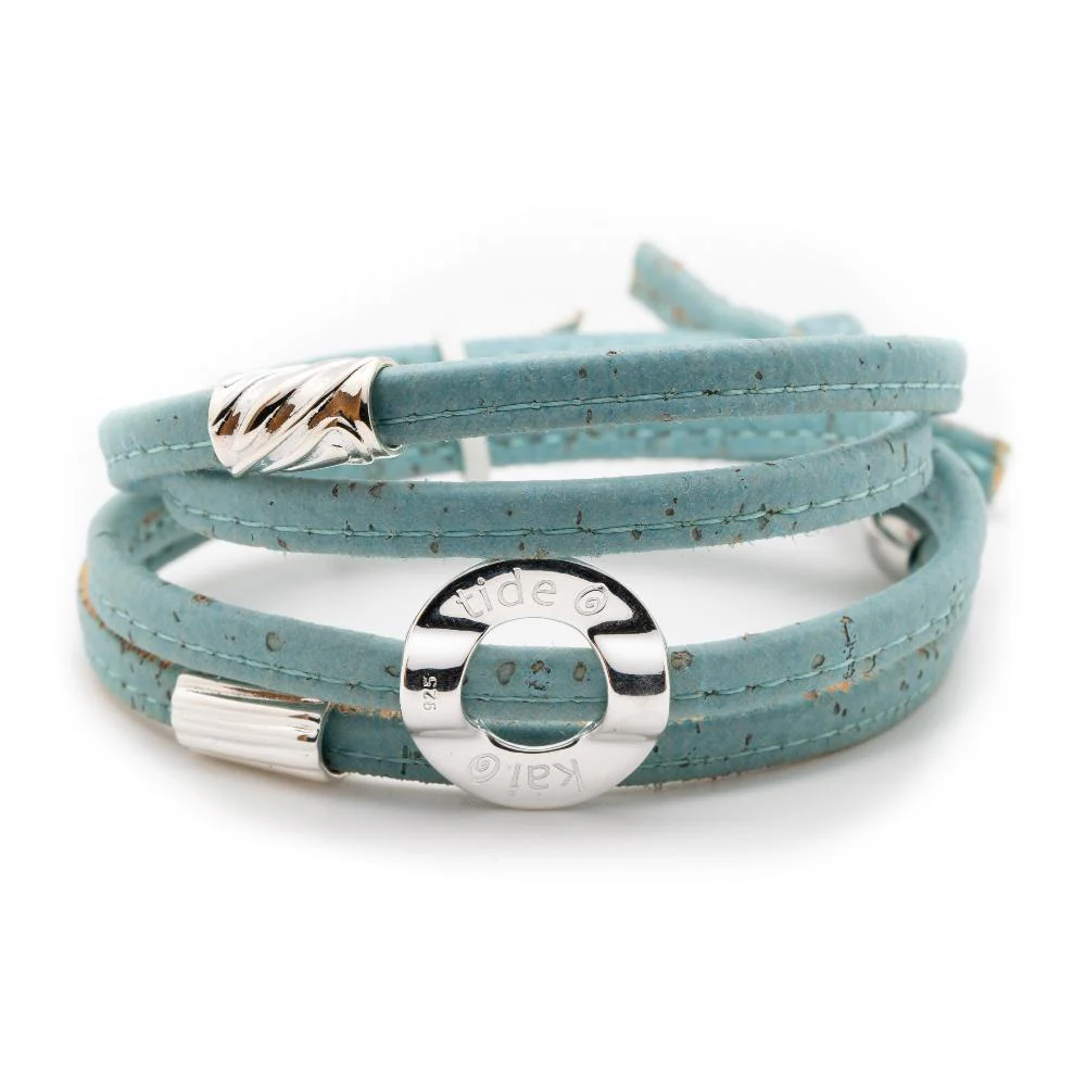 Our Nature Lover Bracelet is a complete bracelet set available on a turquoise, green or natural organic cork wrap with the Silver Moon & Tide Bead and our Ripple & Swirl Bead set.